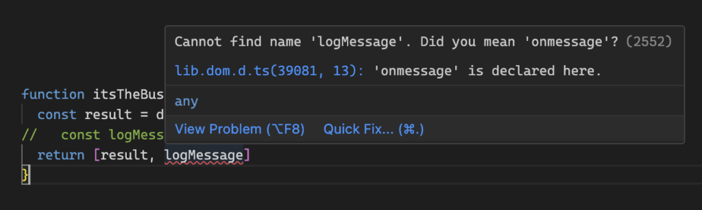 The type signature says that this function returns a BusinessResult, but it’s also doing some logging, so isn’t telling teh whole store of what this function does through the type signature. Currently, console.log doesn’t return anything useful; undefined doesn’t tell us it worked or what the data was.